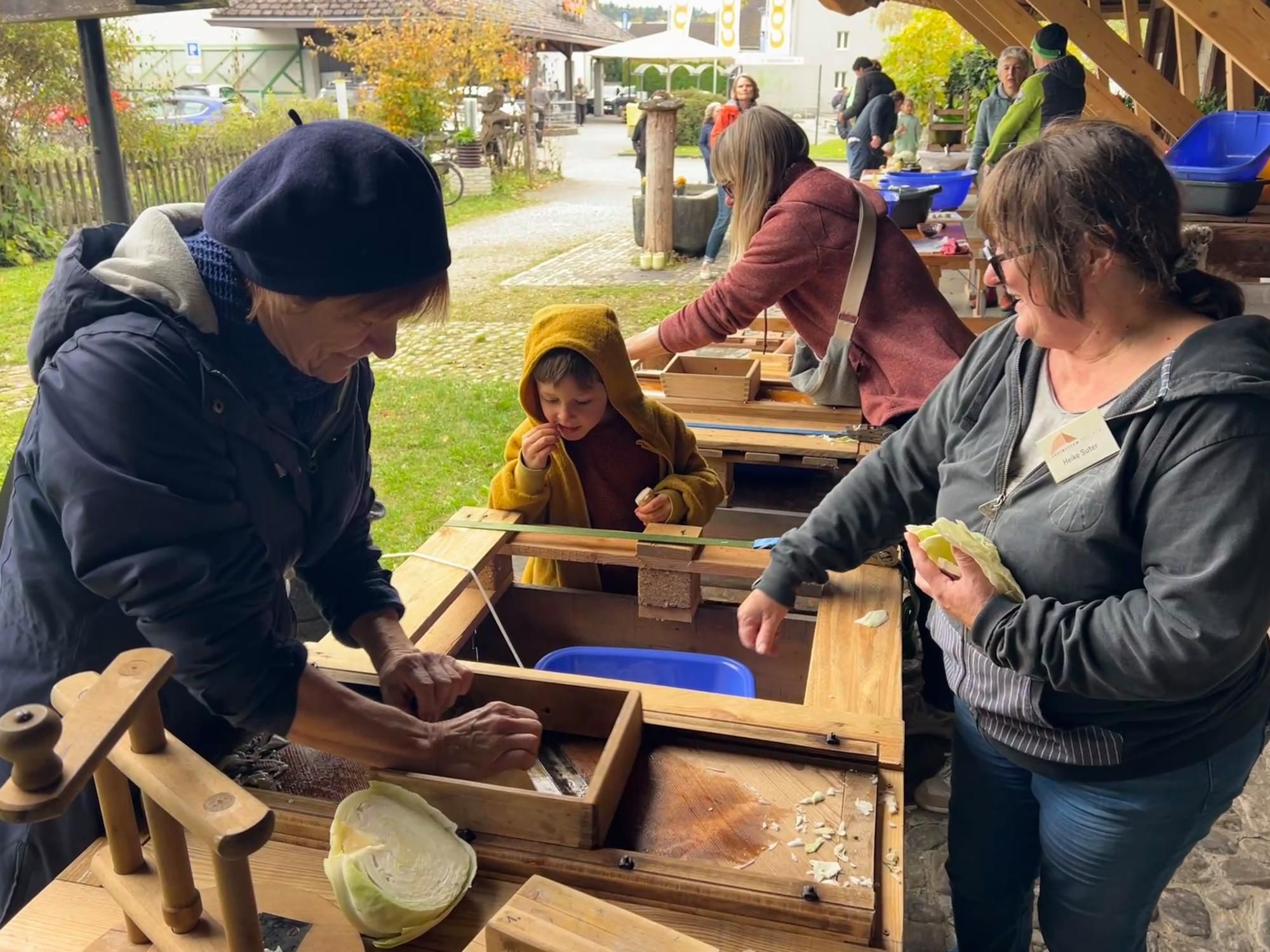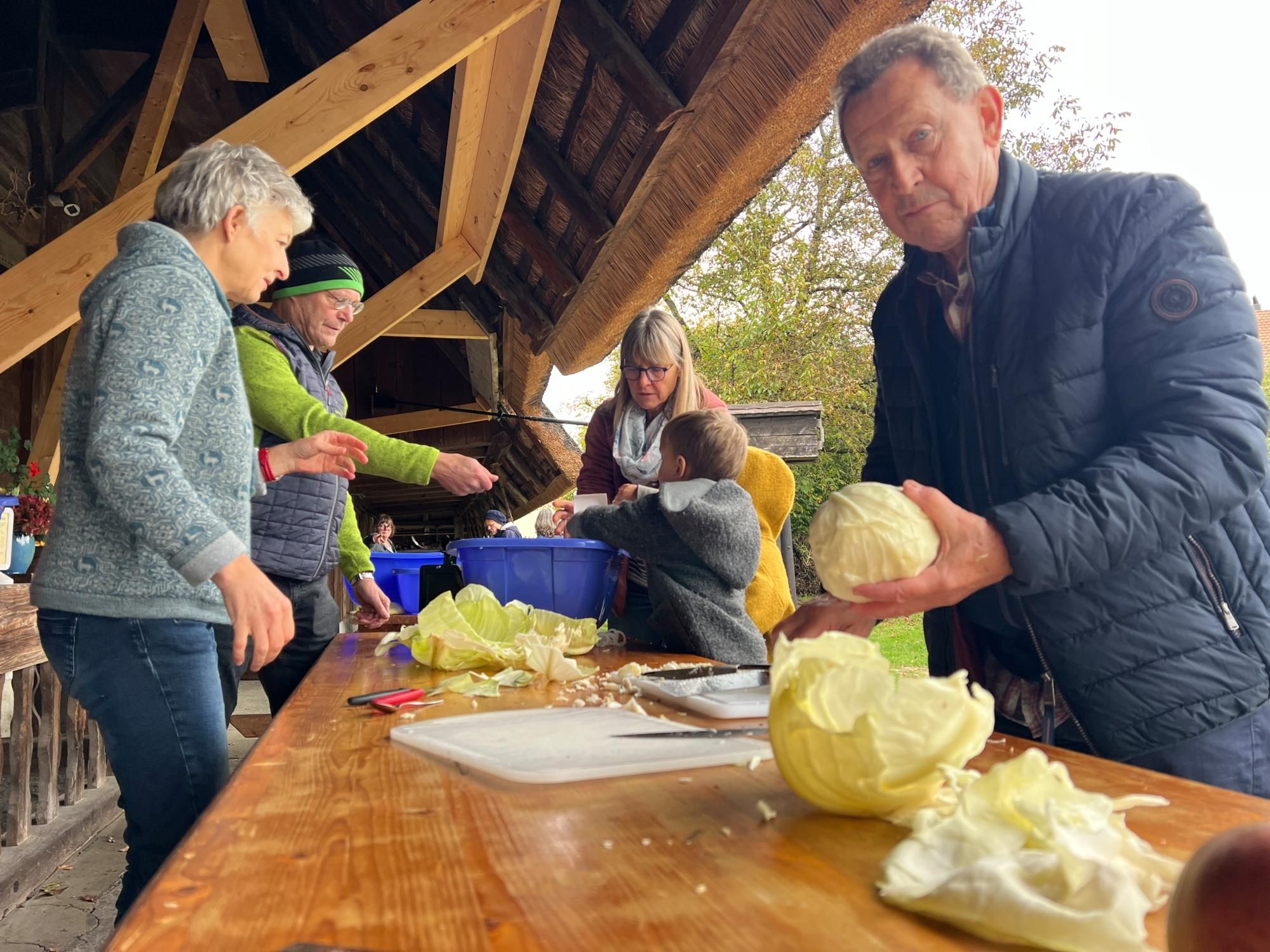 Die ersten Teilnehmer sind da, schnappen sich einen Chabis, stechen den Strunk aus und hobeln kräftig. Dann wird geknetet, also gewalkt, mit Salz und Wachholderbeeren gewürzt, das Ganze ins Original Weckglas gepresst und gut verschlossen. «Dies ist eine der ältesten Methoden, um die Weisskohlernte haltbar zu machen», erzählen die Helferinnen und Helfer des Dorfmuseums den Teilnehmenden. Bis zum Samichlaustag am 6. Dezember soll das Glas ruhen. Ab dann kann man das Sauerkraut konsumieren, am besten ungekocht.