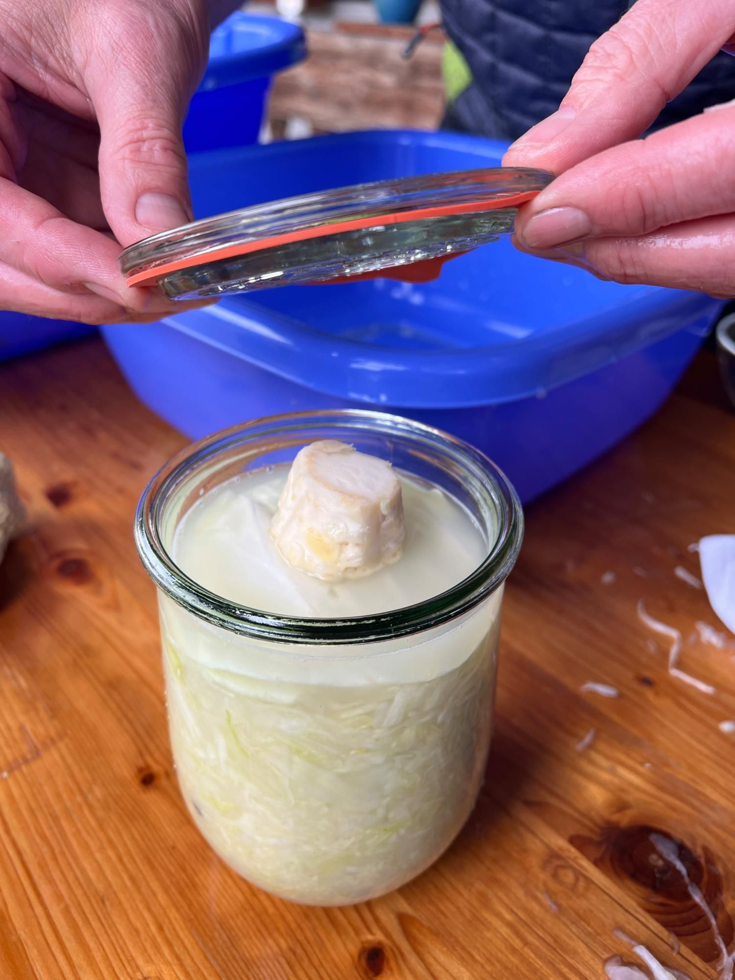 Heike Suter vom Dorfmuseum (rechts) begleitet die Teilnehmenden der «Chabishoblete». – Bild: Kaspar Flückiger Der Chabis, ein Bio-Weisskohl vom Mattenhof, wird zu Sauerkraut verarbeitet. – Bild: Kaspar Flückiger Auch Andrea-Carlo Polesello, Präsident der Museumskommission, macht aktiv mit an der «Chabishoblete». – Bild: Kaspar Flückiger Bevor der Glasdeckel drauf kommt, wird ein Kabisblatt und der ausgestochene Strunk zum Abdichten über das Kraut gelegt. – Bild: Kaspar Flückiger