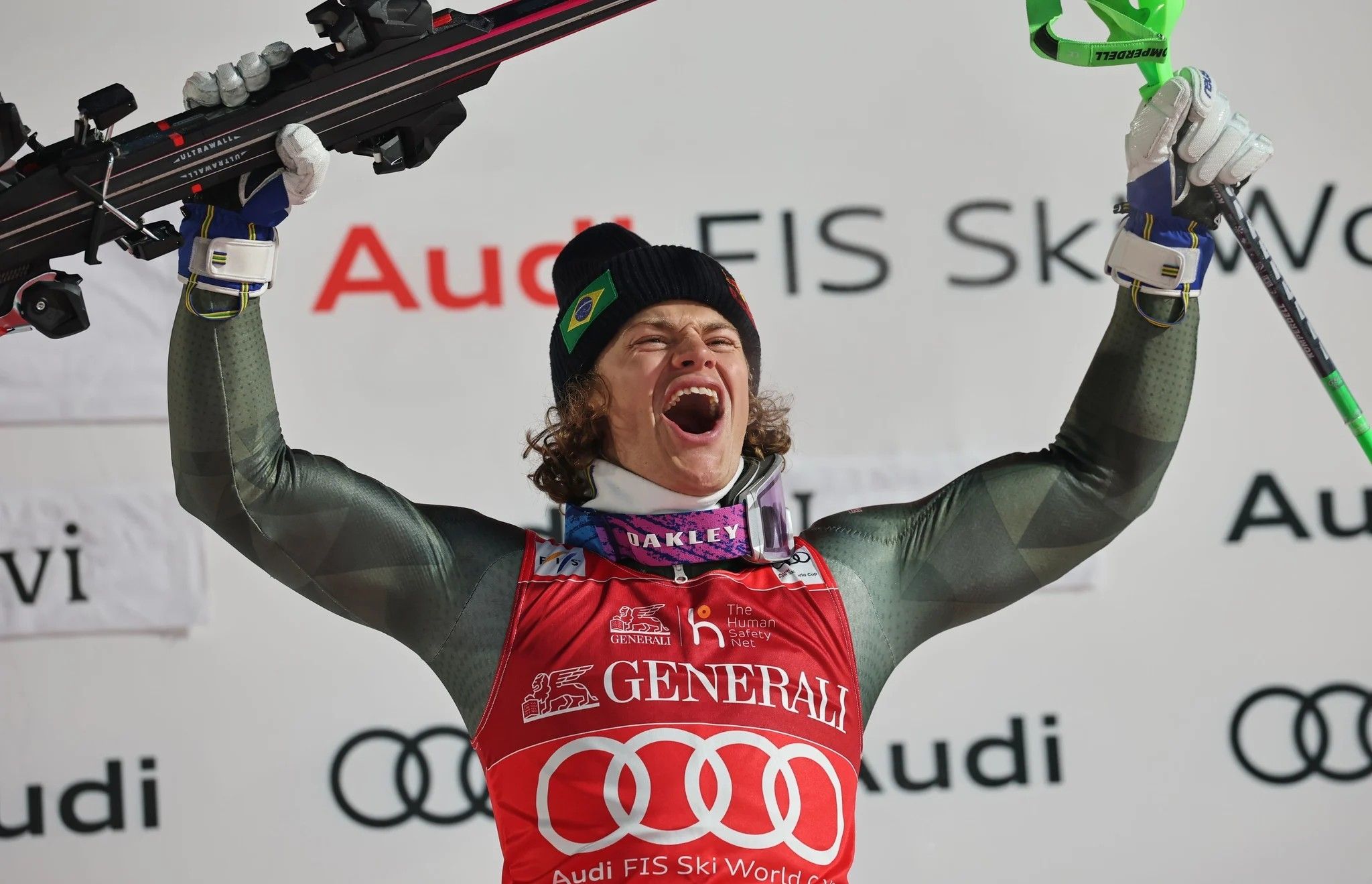 Lucas Pinheiro Braathen freut sich über seinen ersten Weltcup-Sieg für Brasilien.