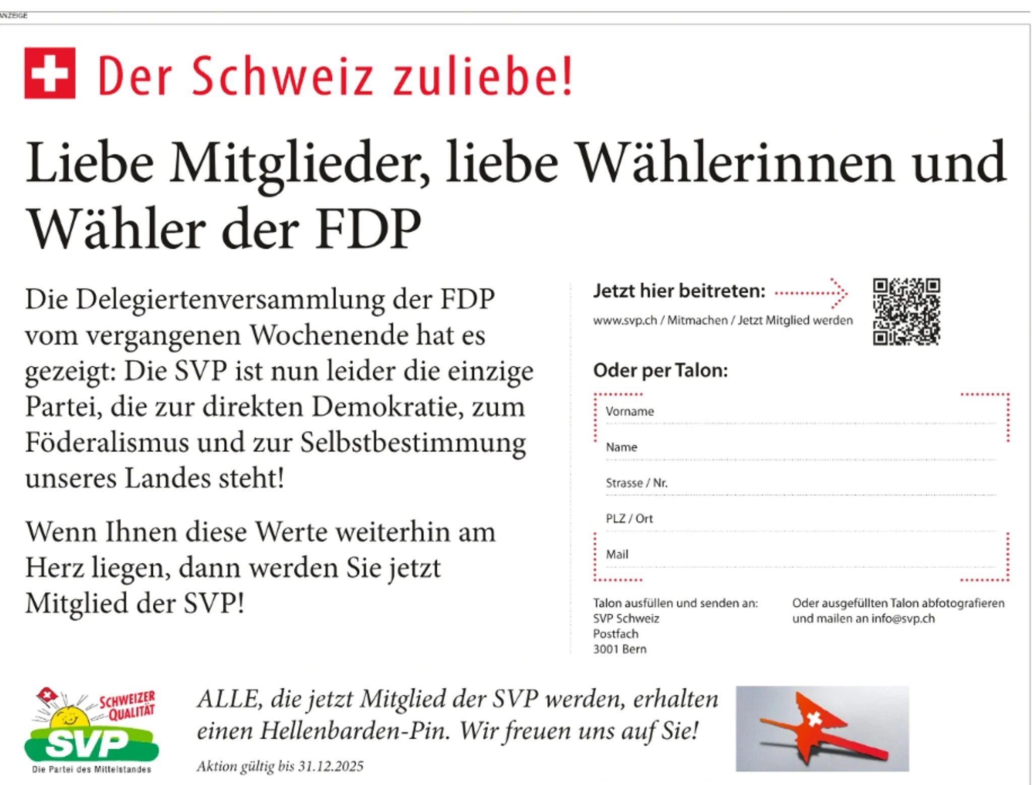 Sie sei die Alternative für enttäuschte Freisinnige. So hat die SVP in einem grossen Zeitungsinserat FDP-Wähler zum Parteiwechsel animiert, die nicht hinter dem FDP-Ja zum EU-Abkommen stehen können. Die Delegierten der FDP hatten die EU-Verträge mit 330 zu 104 Stimmen gutgeheissen. Die SVP dagegen lehnt diese ab. Das Abkommen mit der EU sieht vor, dass die Schweiz teilweise EU-Recht übernimmt.