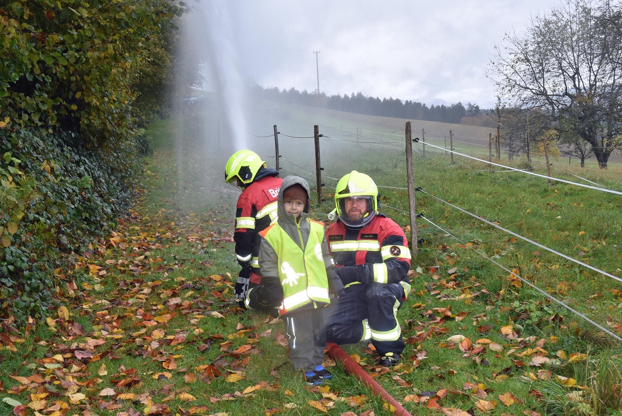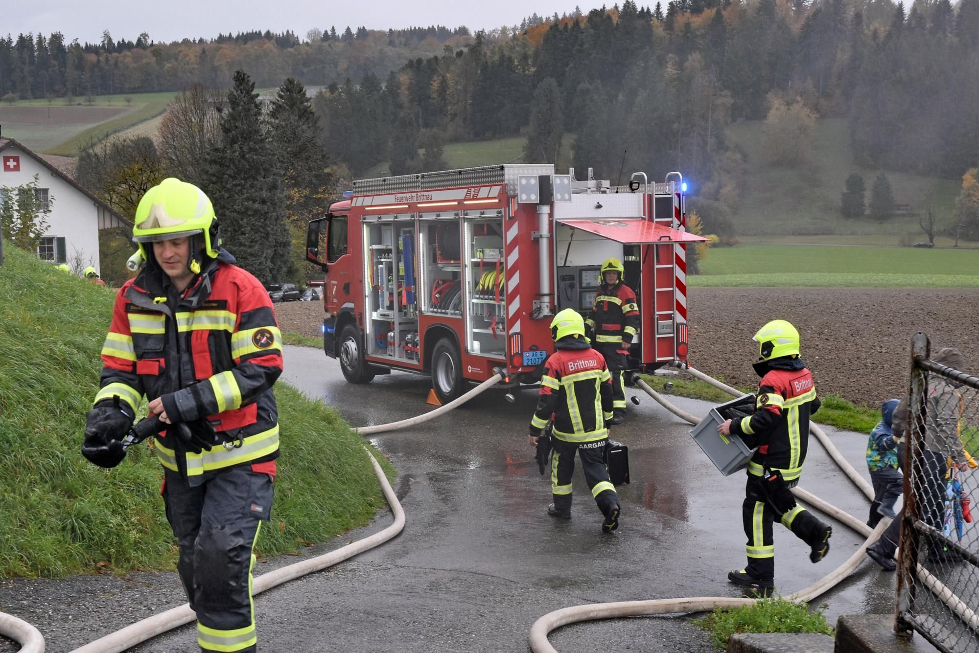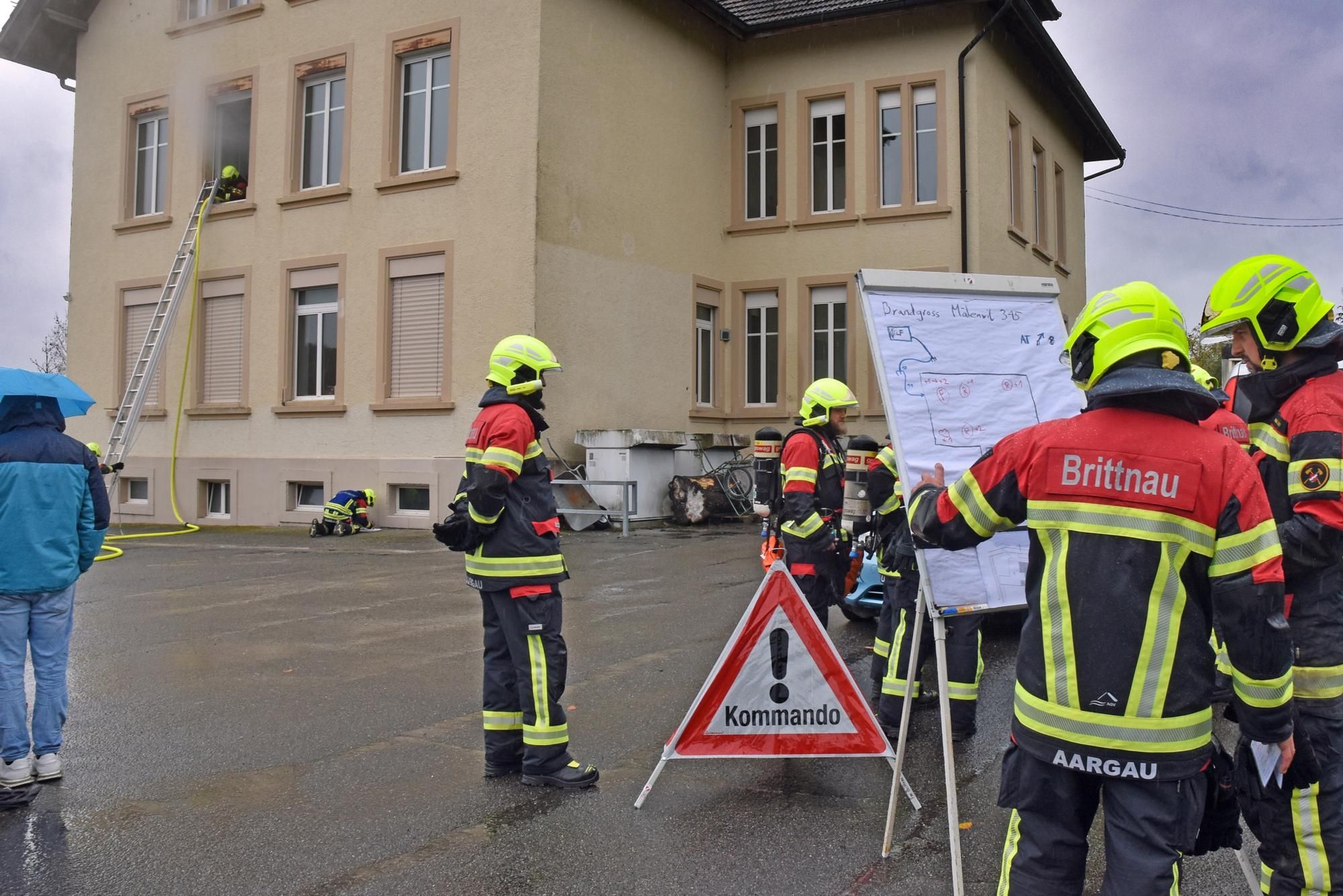 Was machen Jugendliche am Samstagnachmittag im alten Schulhaus Mättenwil? Klar, sie warteten auf die Feuerwehr, die sie aus den brennenden Stockwerken befreien sollen – natürlich nur übungshalber, denn die Gesamtübung der Feuerwehr Brittnau erforderte ein reales Szenario. Der aus den Fenstern dringende Rauch war für die unter den Regenschirmen ausharrenden Brittnauer Feuerwehr-Fans unübersehbar. Bereits acht Minuten nach der Alarmmeldung fuhr der erste Zug vor, vorgegeben sind maximal zehn Minuten. Davor trafen bereits einzelne Feuerwehrleute auf Motorrädern am Einsatzort ein.