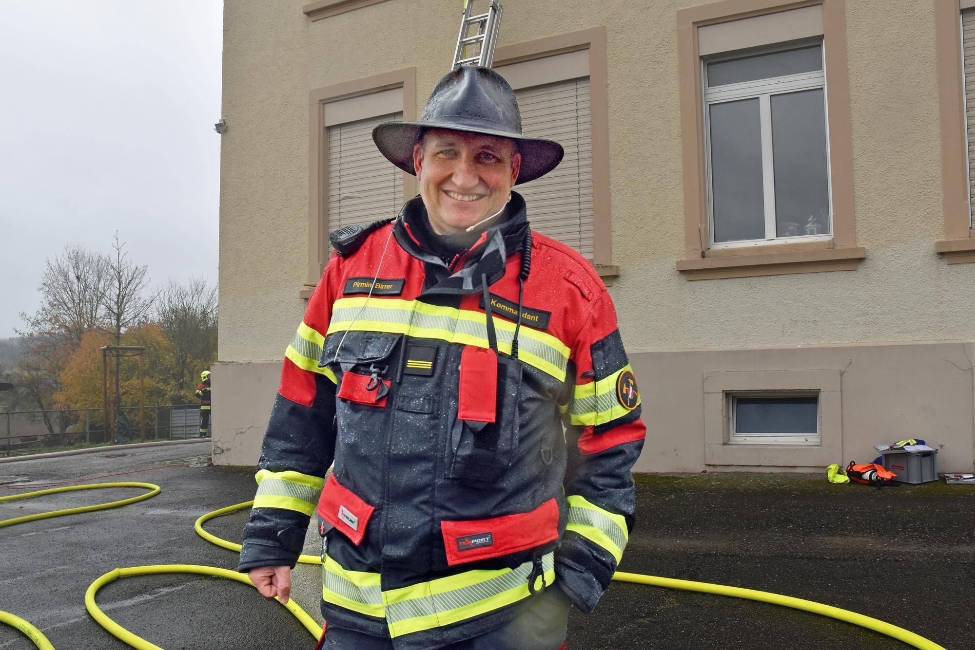 - Kommandant Pirmin Birrer kommentierte den Übungsablauf mit dem Mikrofon. – Bild: Alfred Weigel