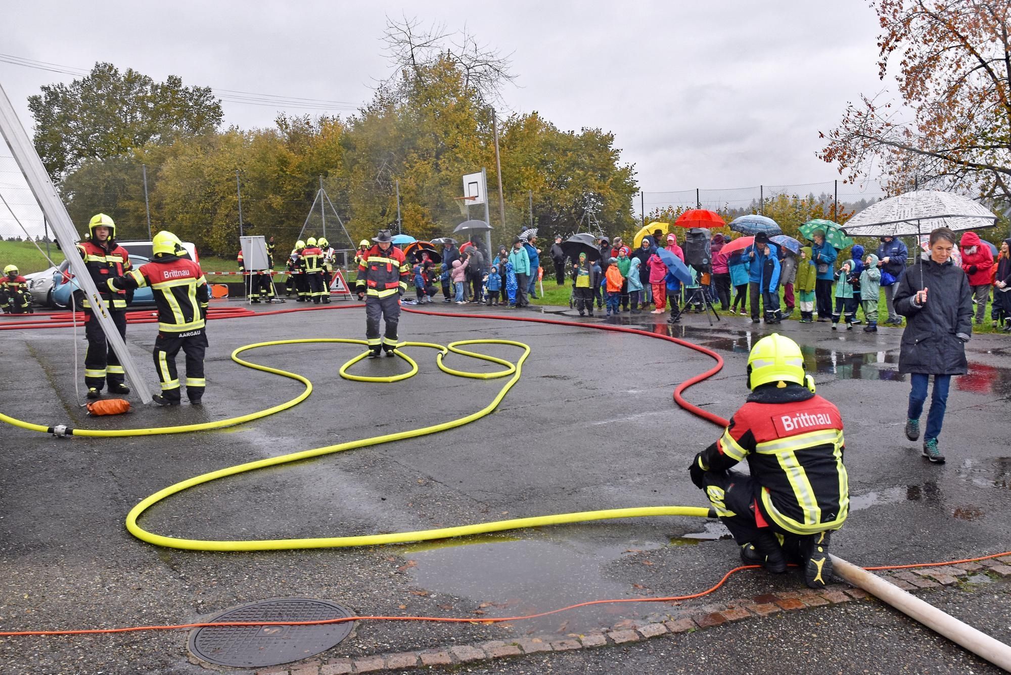 - Unter Regenschirmen verfolgten die Brittnauer Bevölkerung die Übung am Schulhaus Mättenwil. – Bild: Alfred Weigel