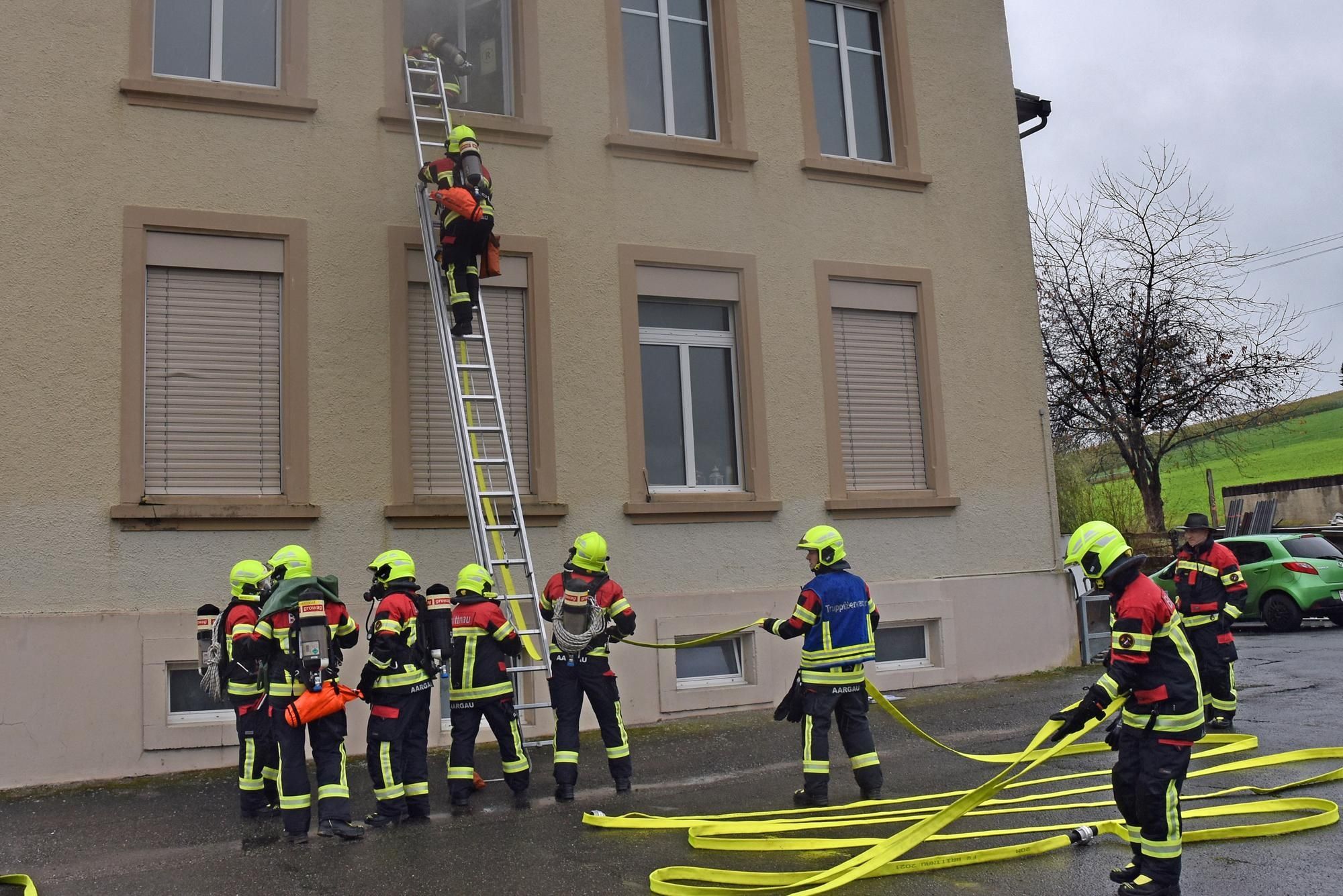 Wie und wo die Einsatzfahrzeuge parkiert werden müssen, wiederholte Einsatzleiter Philippe Basler mehrmals. Ob es in der Vergangenheit nicht so gut mit dem Parken geklappt hatte? Bevor die Atemschützer das Gebäude betraten, klemmten die Elektriker vorsorglich den Strom ab. Vorbildlich funktionierte das Schlauchmanagement, ebenso die Personenrettung über Leitern an Vorder- und Seitenfront des ehrwürdigen Schulgebäudes, in dem jetzt Wohnungen, ein Dentallabor und Dorfvereine untergebracht sind. An seine im Übungsobjekt verbrachte Schulzeit mit 25 Schülern pro Klasse erinnerte sich ein Feuerwehrveteran noch sehr gut.