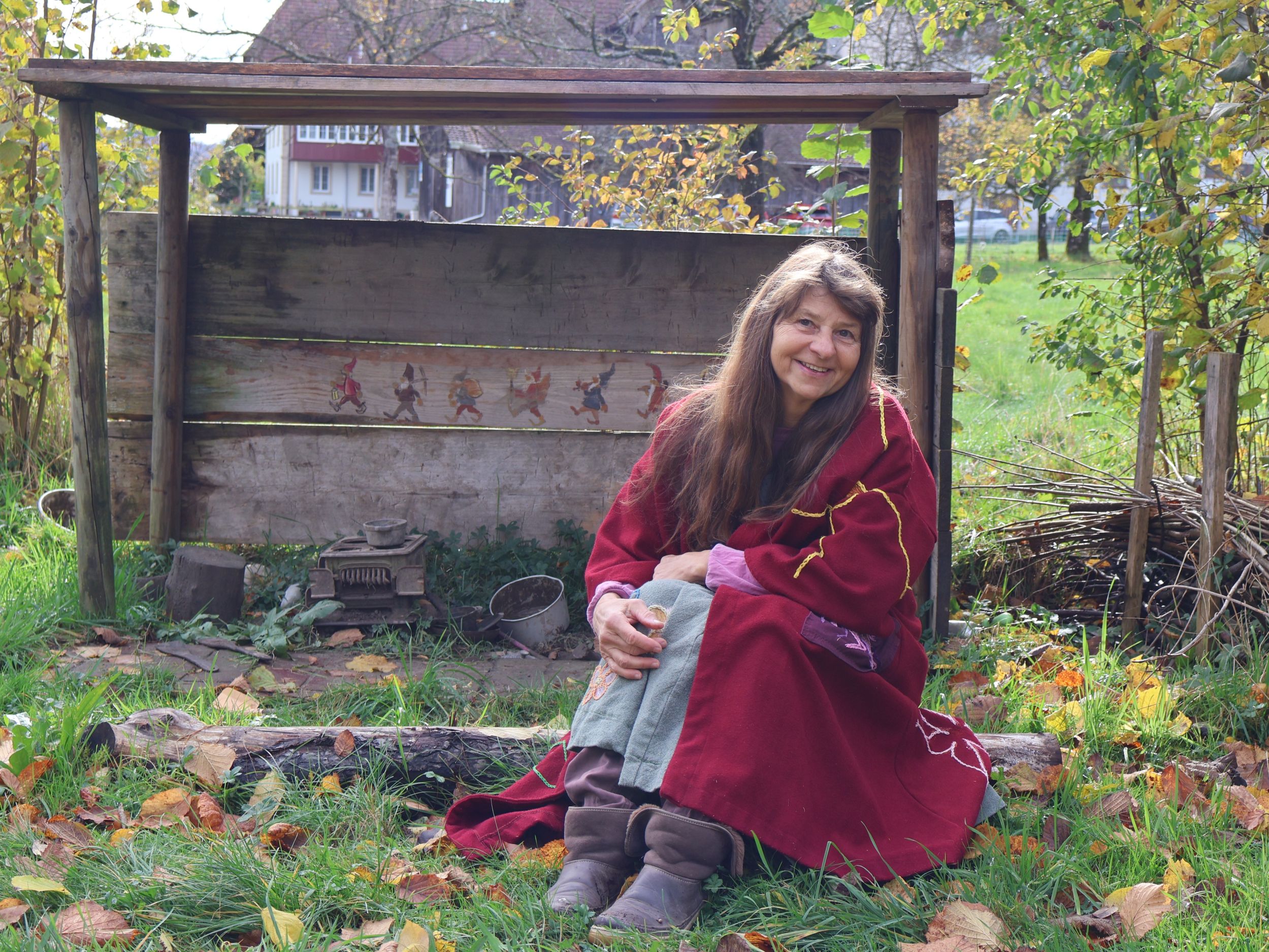 Hinter dem Bauernhaus, das als Wohnort, aber auch Märchenstube dient, begrüsst Eleonora Tschamper bereits passend gekleidet ihre Zuhörerinnen und Zuhörer. Ihr Gewand mutet mittelalterlich an, darüber trägt sie einen mit Mustern bestickten, bordeauxroten Umhang.