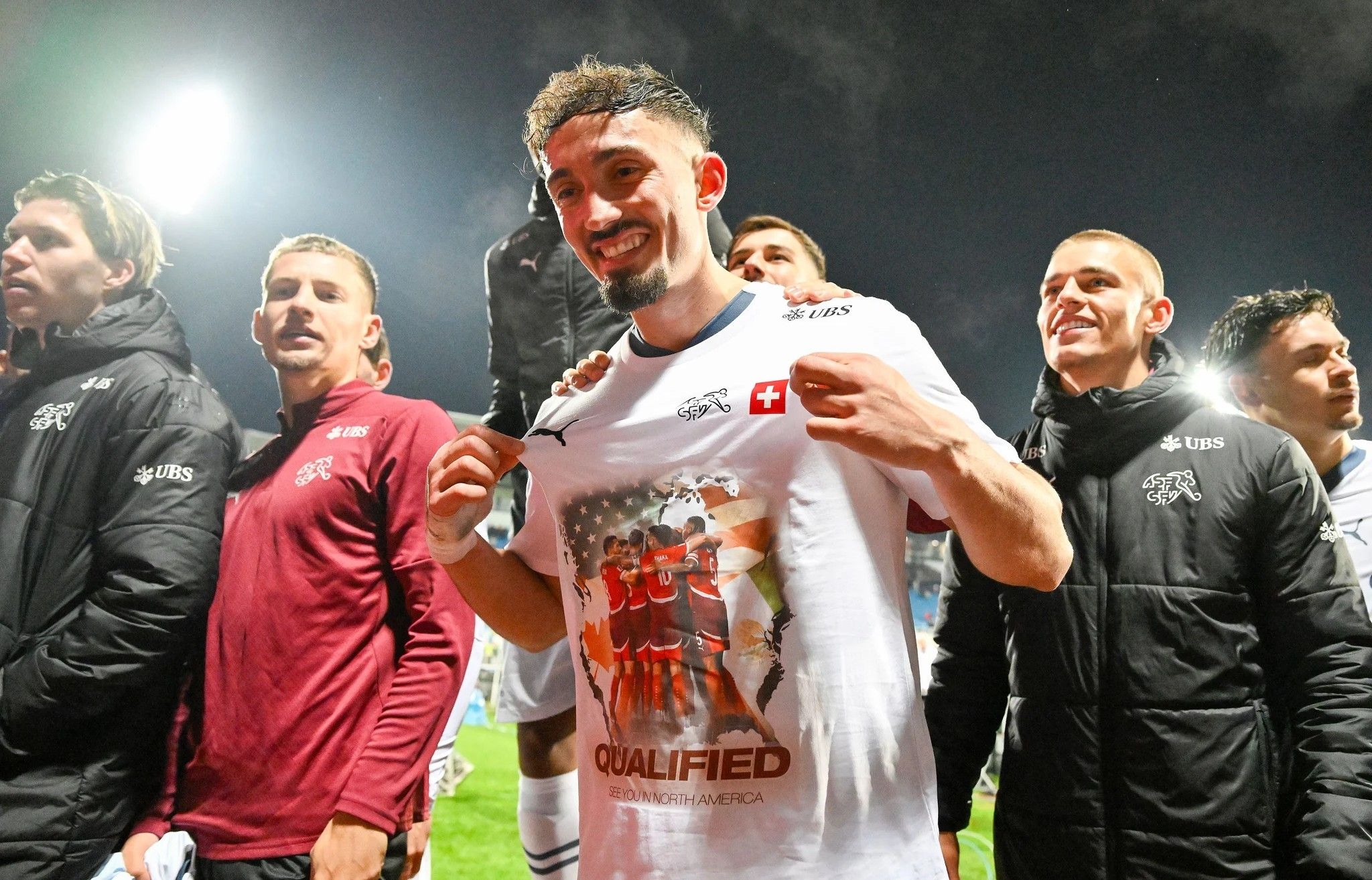 «Qualified»: Andi Zeqiri zeigt das Siegershirt. – Bild: Toto Marti / Freshfocus (Pristina, 18. 11. 2025)