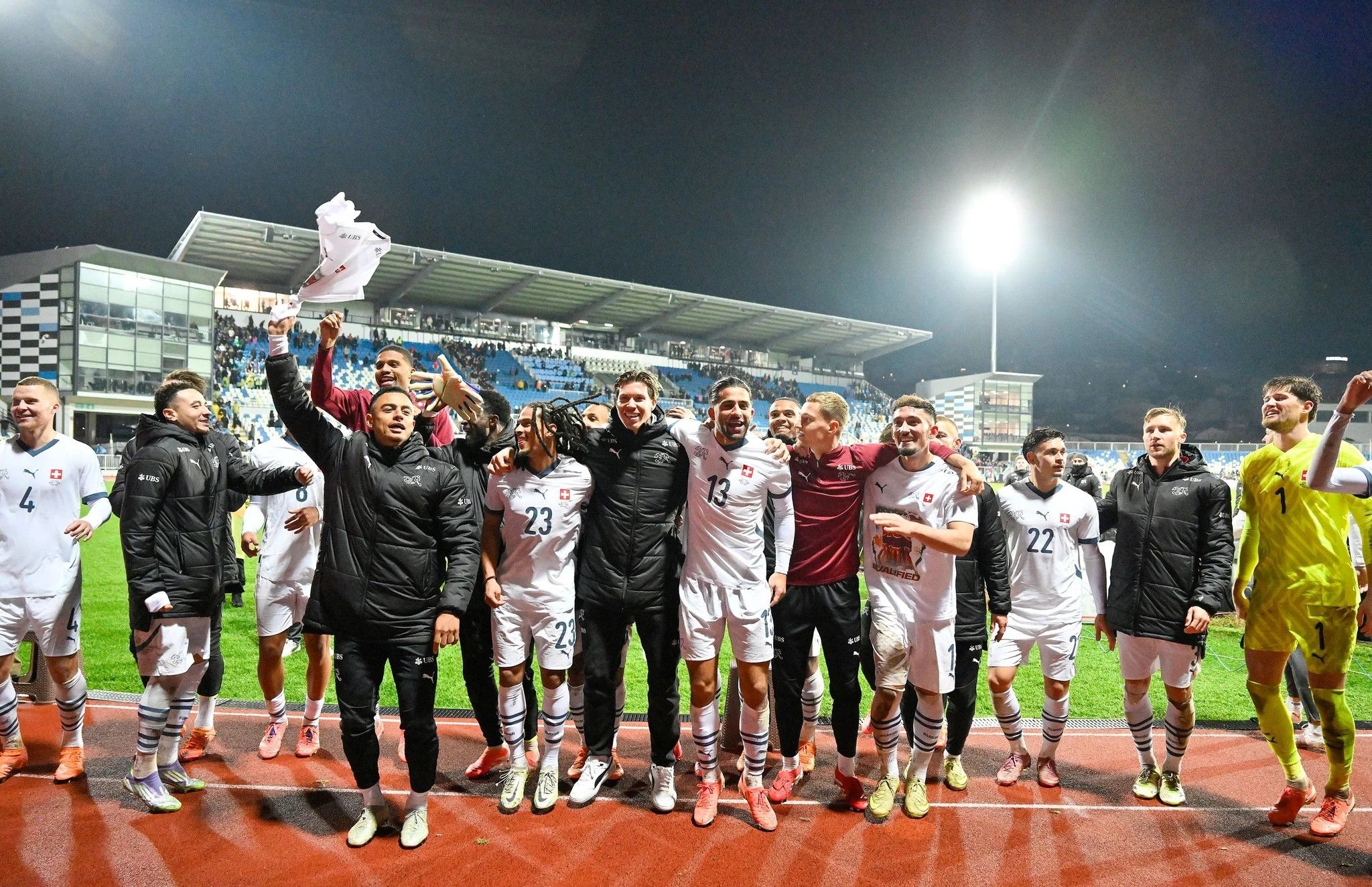 Die Schweizer feiern die Qualifikation nach dem Match. – Bild: Toto Marti / Freshfocus (Pristina, 18. 11. 2025)