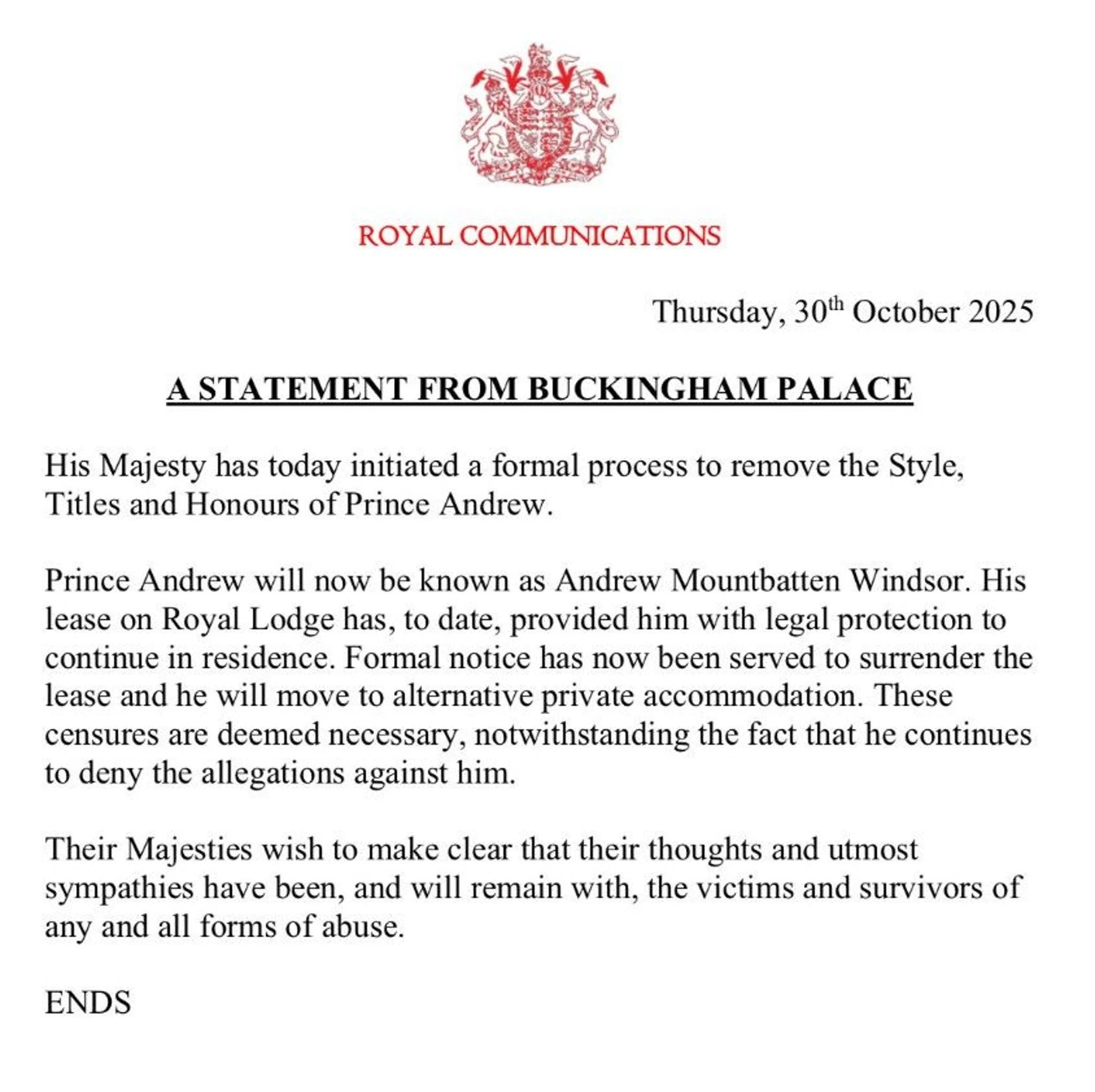 Der britische König Charles III. entzieht Prinz Andrew auch noch seine restlichen Titel. Der 65-Jährige werde fortan als Andrew Mountbatten Windsor und nicht mehr als Prinz bekannt sein, teilte der Buckingham-Palast am Donnerstagabend mit. Zudem müsse Andrew aus seinem Anwesen Royal Lodge ausziehen.