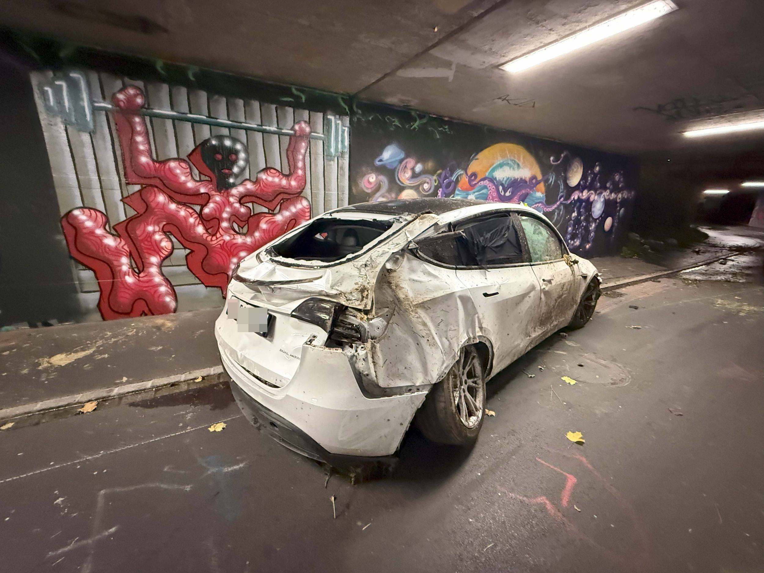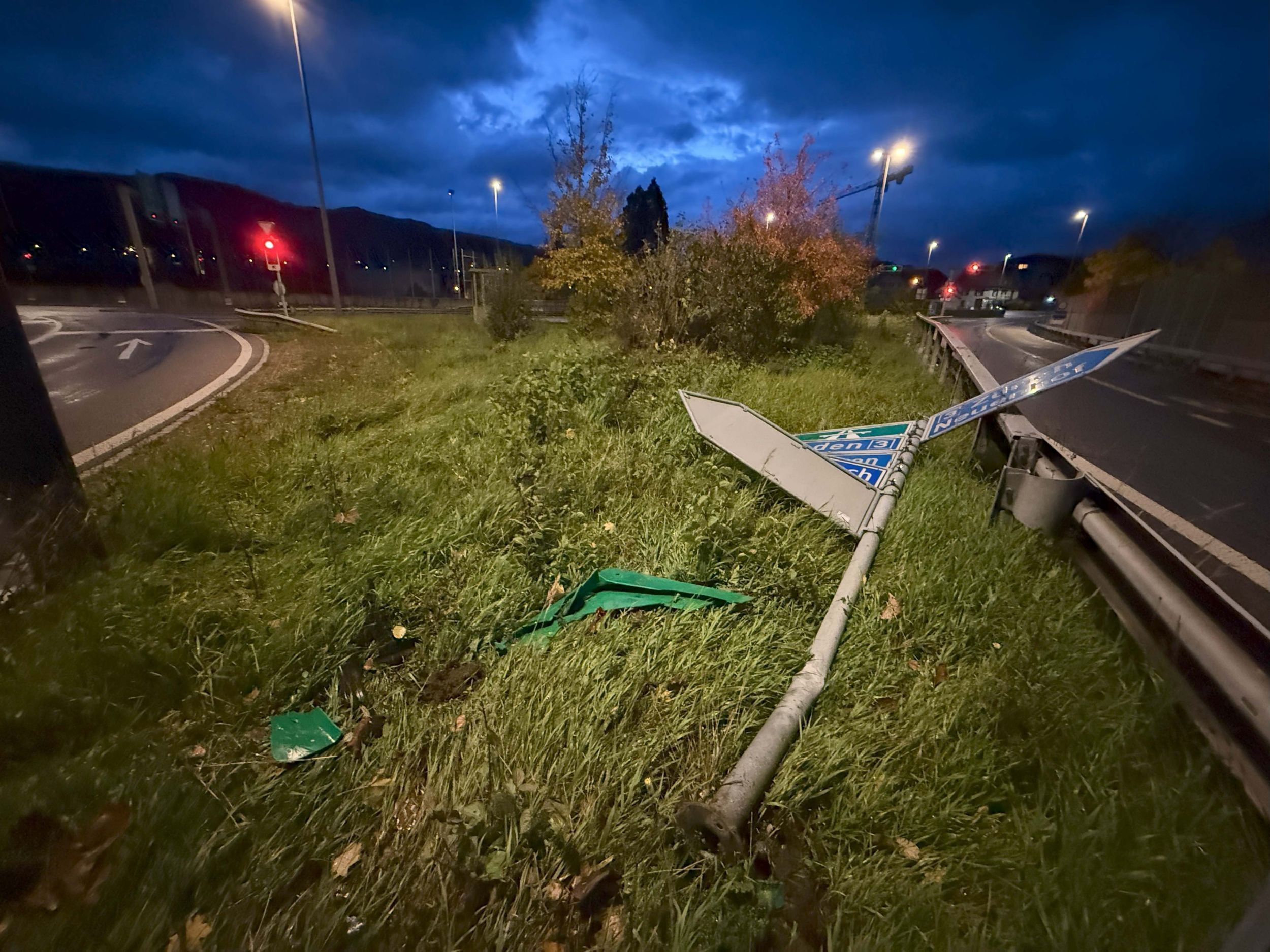 Der Unfall ereignete sich am frühen Sonntagmorgen beim A1-Anschluss Neuenhof. Eine Frau meldete sich kurz nach sechs Uhr auf dem Polizeinotruf und gab sich als Verursacherin aus. Wie sich zeigte, war der Tesla auf der Zürcherstrasse von der A1 kommend in Richtung Zentrum gefahren. Bei der Verzweigung eingangs Dorf war er von der Fahrbahn abgekommen und gegen den Pfahl der Signaltafel geprallt. Danach stürzte der Tesla die Böschung hinab und landete in der dortigen Unterführung.