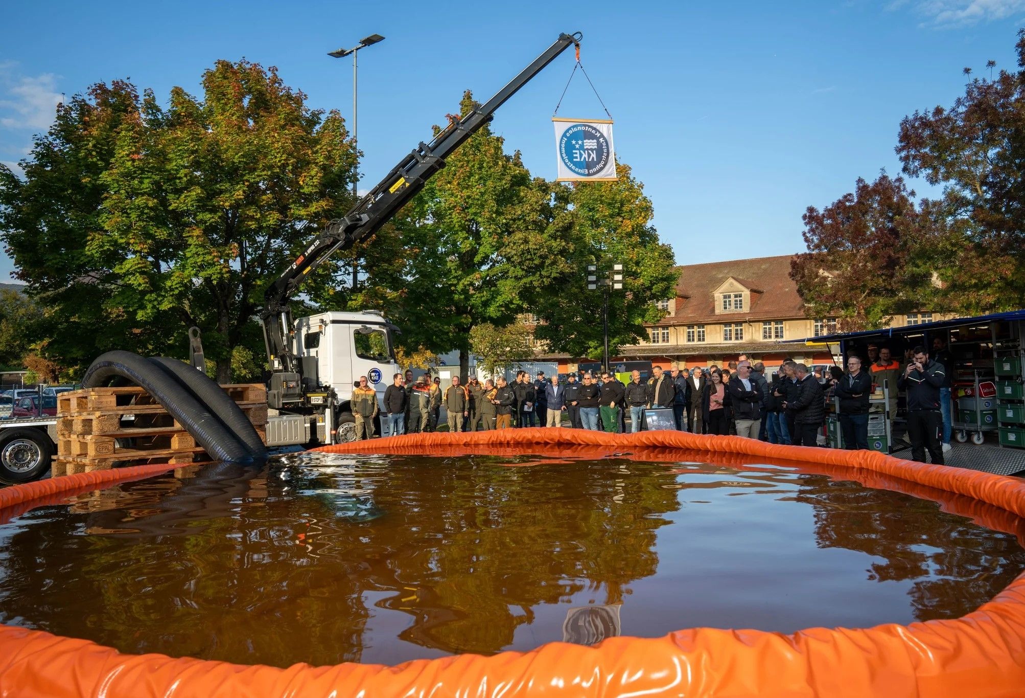 Auch eine Delegation der Sicherheitskommission des Grossen Rats, inklusive Kommissionspräsidentin Nicole Heggli-Boder (SVP), sahen sich die Demonstration an: Dazu wurden 35’000 Liter Wasser von einem mobilen Becken in ein anderes gepumpt. In unter drei Minuten war das Ziel erreicht und das vorher prall gefüllte, orange Behältnis leer.